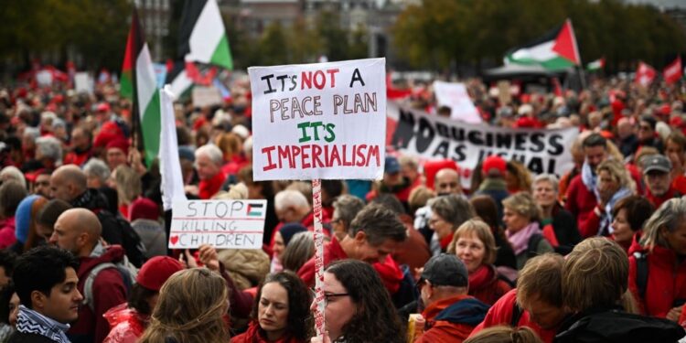 Approximately 250,000 people gathered in Amsterdam against the government’s pro-Israeli policies. One of the slogans was “It’s not a peace plan, it’s Imperialism.”
