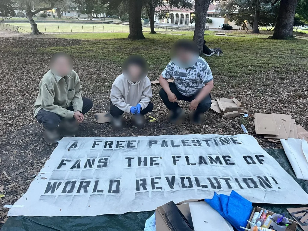 In Commemoration of two years of Al Aqsa Flood activists in Oakland made a banner in support of the Palestinian cause, connecting the struggle of the Palestinians to the World Revolution.