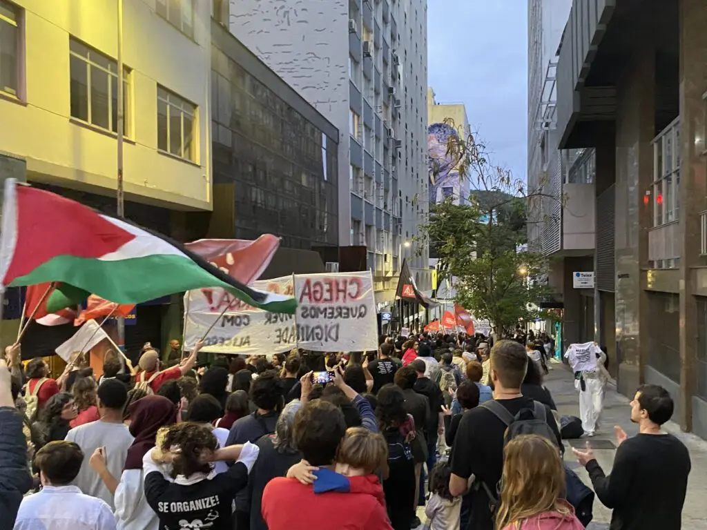 Featured image: Demonstration in Maringá against genocide with a banner at the forefront of the mobilization.