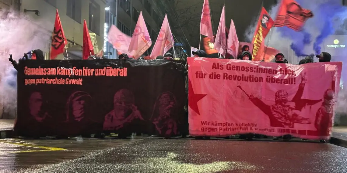 The Purple-Red Collective called out with the slogan “On November 25, we take to the streets against all forms of violence against women, imperialist aggression, and racism,” carrying a banner that read in German, “Let us turn our anger into resistance on our day of struggle.” Additionally, they held signs honoring Renukayoldaşı, a cadre of the Communist Party of India (Maoist) who was killed by the reactionary Indian state, and Adivasi women resisting in India, as well as signs for Gülistan Doku, who was lost in Dersim on January 5, 2020. Protesters chanted: “Where is Gülistan Doku?”
