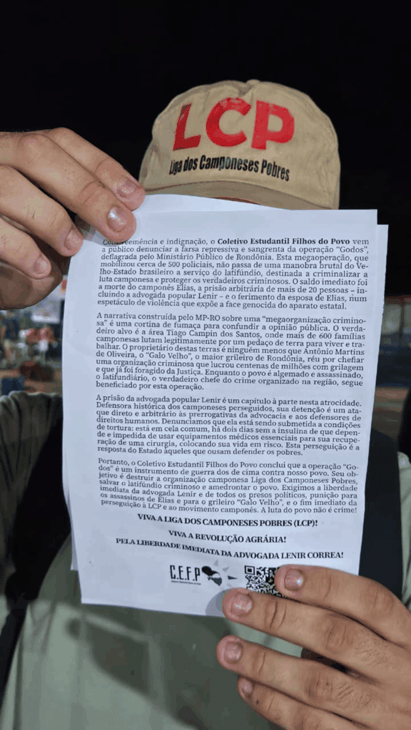 Several actions took place in Brazil against the persecution of the popular lawyer Lenir Correia, who was arrested for doing her job as lawyer. She was persecuted after the so-called “Operation Godos”, a police operation against the League of the Poor Peasants in Rondônia.