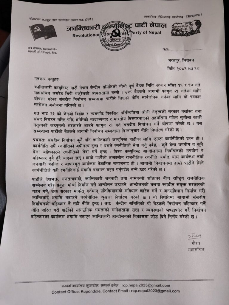The Revolutionary Communist Party of Nepal (RCPN) has officially called for a vigorous boycott of the upcoming elections to the House of Representatives, scheduled for March 5. This decision was announced following the Party’s fourth Central Committee meeting. The party disclosed its stance during a press conference in Bharatpur, Chitwan.
