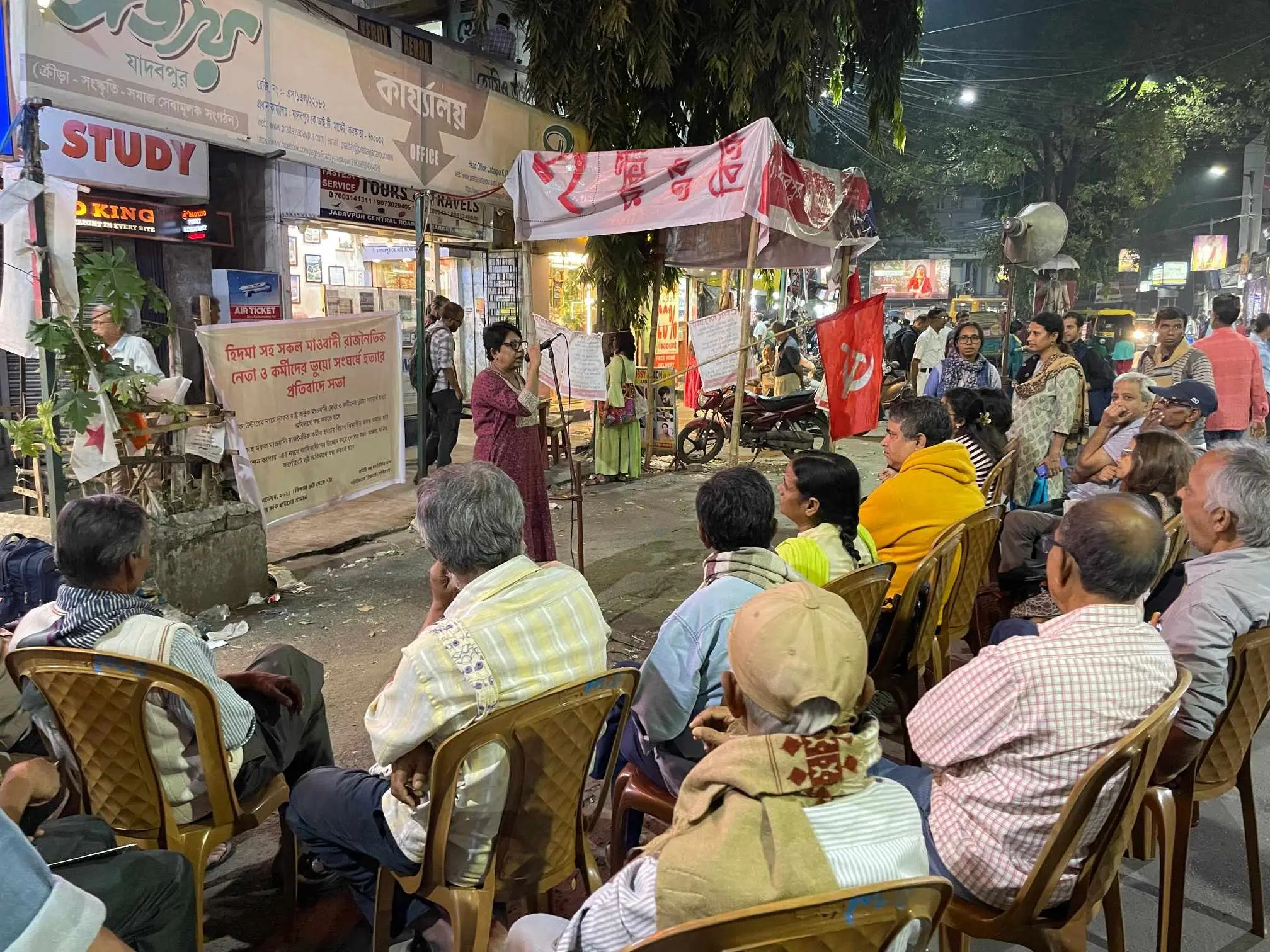 A protest meeting was organized by the Committee for the Release of the Political Prisoners (West Bengal) in front of Jadavpur Coffee House on November 22, 2025, against the killing of Maoist political leaders and activists including Comrade Hidma in fake encounters, against the conspiracy to hand over the vast mineral-rich areas of Central India to the Adani-Ambani corporations and other domestic and foreign corporations by carrying out genocide against the tribals in the name of ‘Operation Kagar’, demanding a judicial investigation into the murder of every Maoist political activist including Comrade Hidma, and the immediate and unconditional release of every political prisoner. Several democratic, progressive mass organizations and individuals including APDR, Revolutionary Students Front (RSF) and FIR spoke at the meeting.