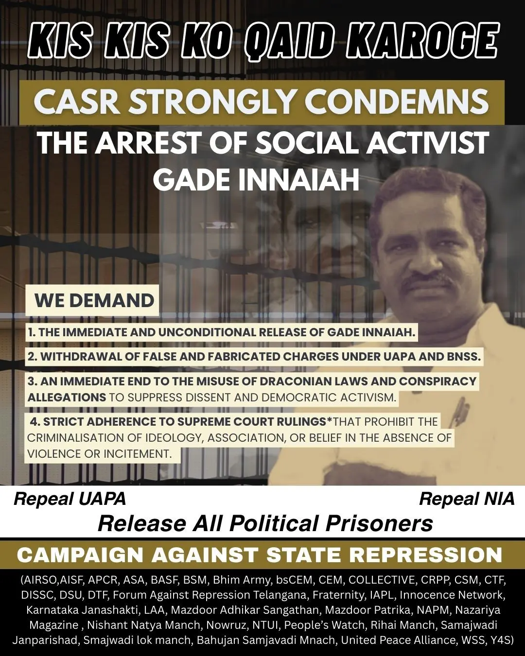 The Campaign Against State Repression stands in unwavering solidarity with Gade Innaiah and all those resisting state repression, and reiterates its firm commitment to defending **constitutional rights, democratic freedoms, and the rule of law.