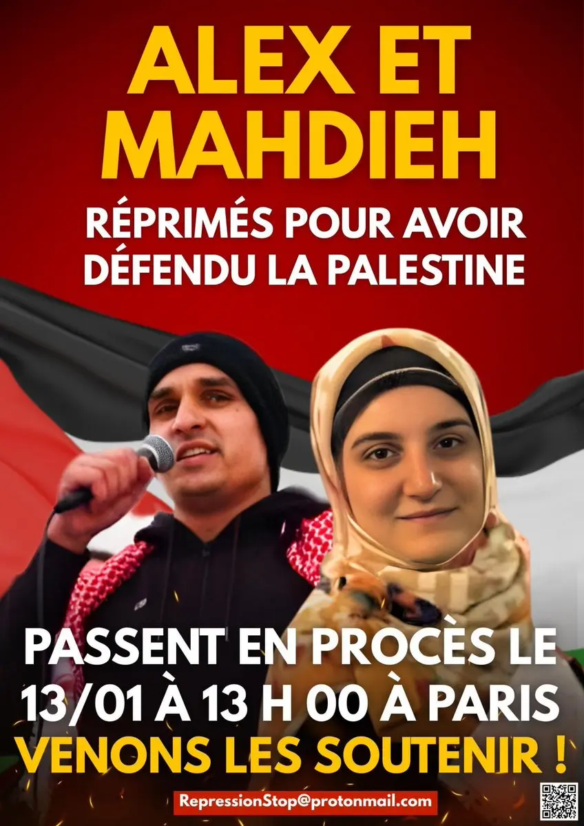 The activists Alex and Mahdieh Esfandiari will face a trial in Paris on 13th of January, reported the Ligue de la Jeunesse Révolutionnaire (LJR). Alex is militant of the LJR. They will be judged due to their support for the Palestinian cause.