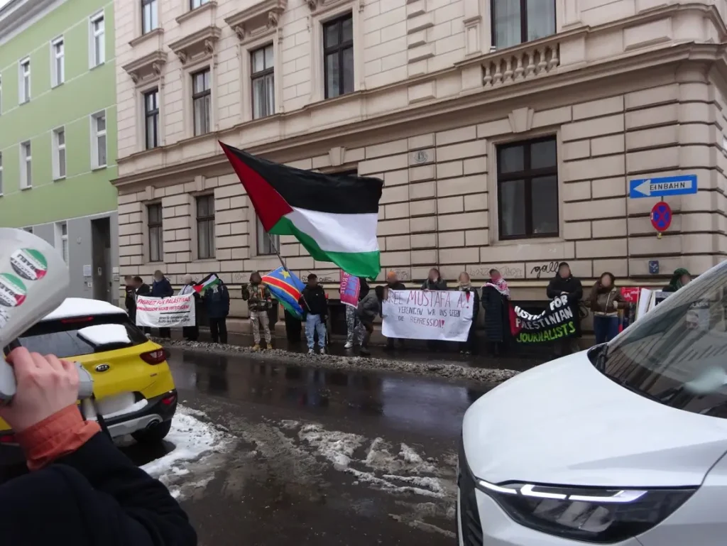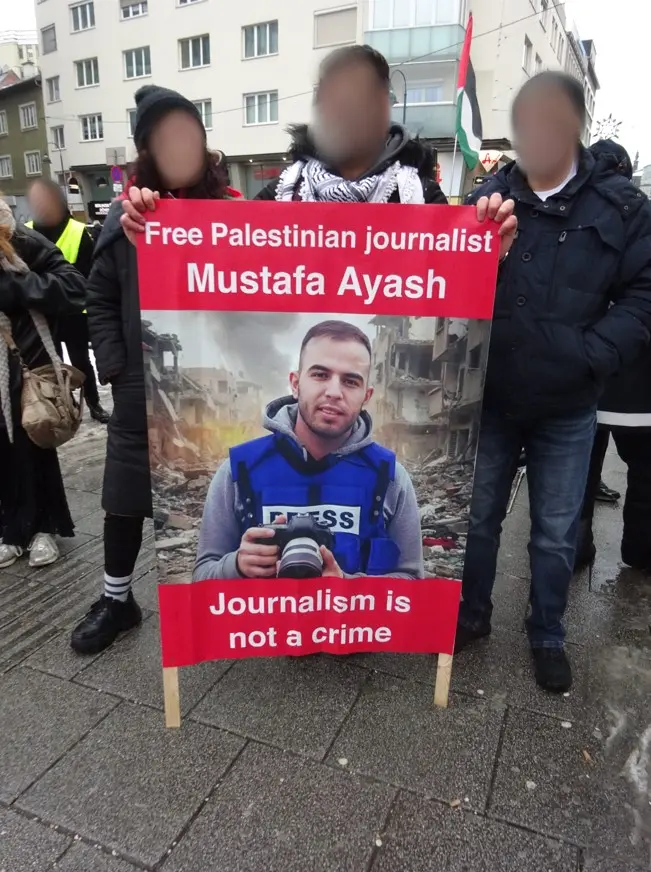 The campaign for the release of political prisoner Mustafa Ayash has been taken up by numerous solidarity groups and is supported in many parts of Austria. The images also illustrate how closely the demand for the release of prisoners and the joint struggle against repression are linked to the slogan “Freedom for Palestine.”