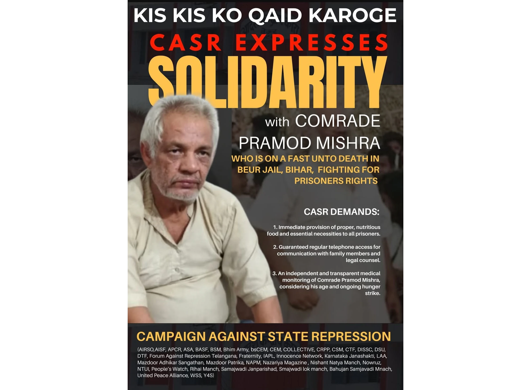 The Campaign Against State Repression (CASR) expresses its unwavering solidarity with political prisoner Comrade Pramod Mishra, a 74-year-old revolutionary activist presently incarcerated in Beur Central Jail, Bihar, where he has been imprisoned for nearly three years.