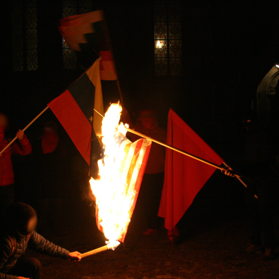 El reporte de Die Rote Fahne Austria añade “Durante la manifestación, los activistas quemaron una bandera estadounidense. Esta acción militante expresó una postura inflexible contra el imperialismo estadounidense”.