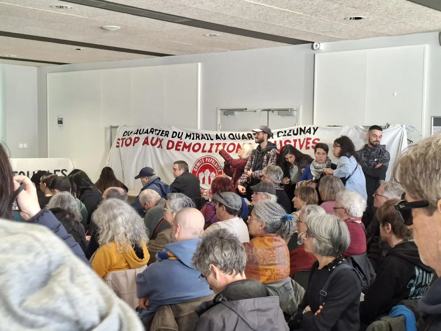 Several candidates from different bourgeois Parties attended the debate and were questioned by the attendees, who clearly asked: “Will you stop the demolitions in Mirail, Côte Pavée, Papus, Tabar and in all the districts of Toulouse where demolition projects remain?”, among other questions.There were numerous contributions from the residents of Toulouse, which denounced the electoral farce and promises made by the bourgeois politicians, their disregard for the inhabitants of the popular neighborhoods and they even denounced those who “play the ‘I’m on the left’ card, etc., in certain bodies, but have no problem running the metropolitan area and having a partnership agreement with the right wing”.