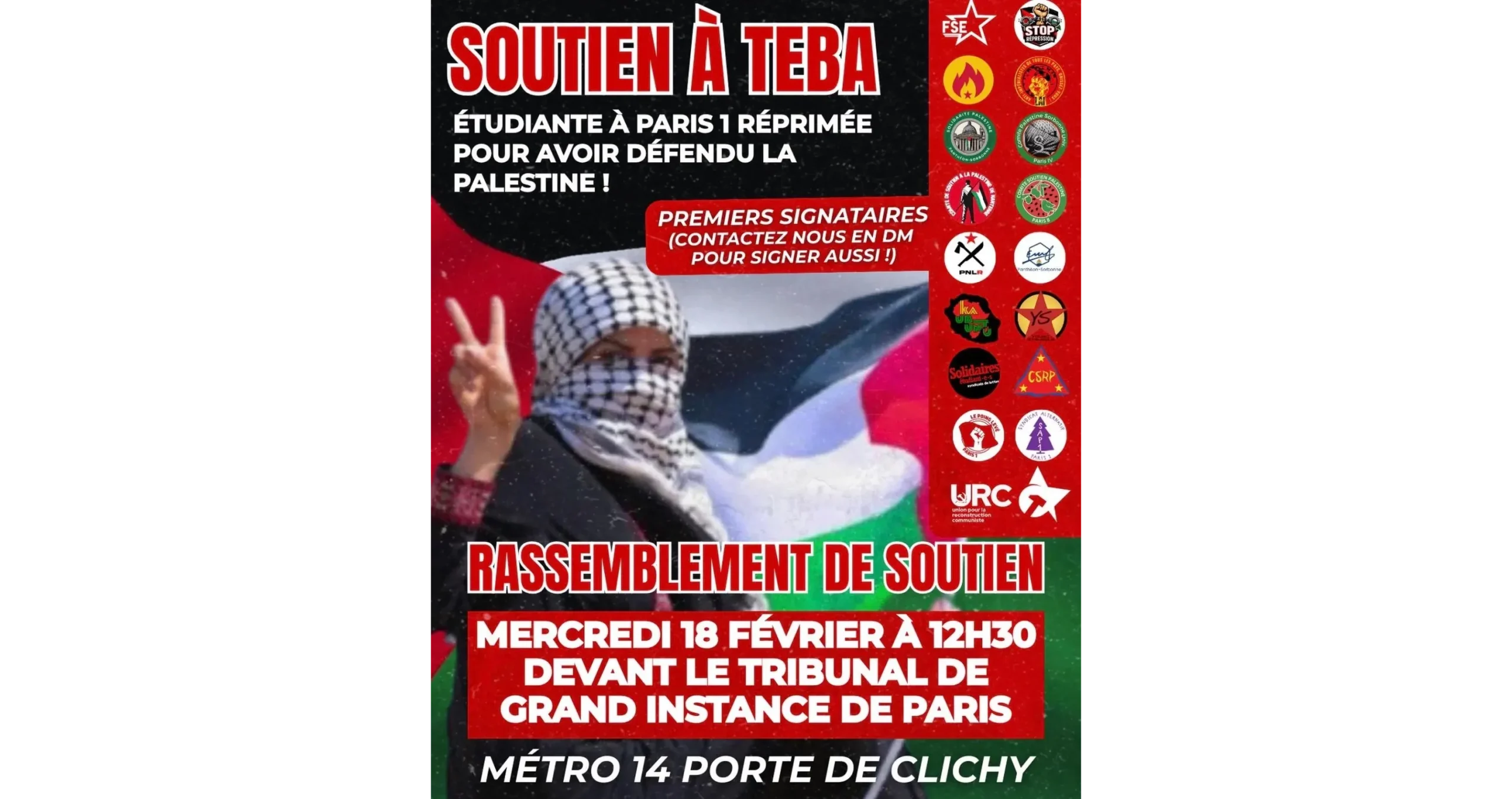 Teba, a student in Paris, must appear in court on Wednesday, 18 February, at 12:30 p.m. for showing solidarity with Palestine.