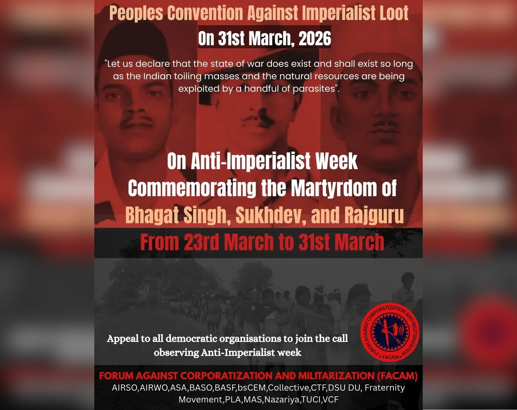 Commemorating the martyrdom day of Bhagat Singh, Sukhdev, and Rajguru on 23rd March, and keeping their historic resistance against imperialism in mind, we give this call. We appeal to all democratic, progressive, and justice loving individuals and organisations to observe anti-imperialist week from 23rd March to 31st March, 2026. We also appeal to all progressive, anti-imperialist forces to join the “People’s Convention Against Imperialist Loot” being organised on 31st March 2026.