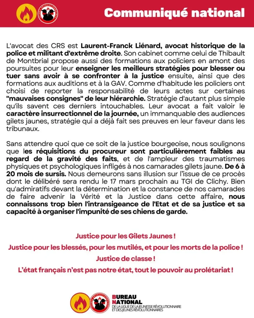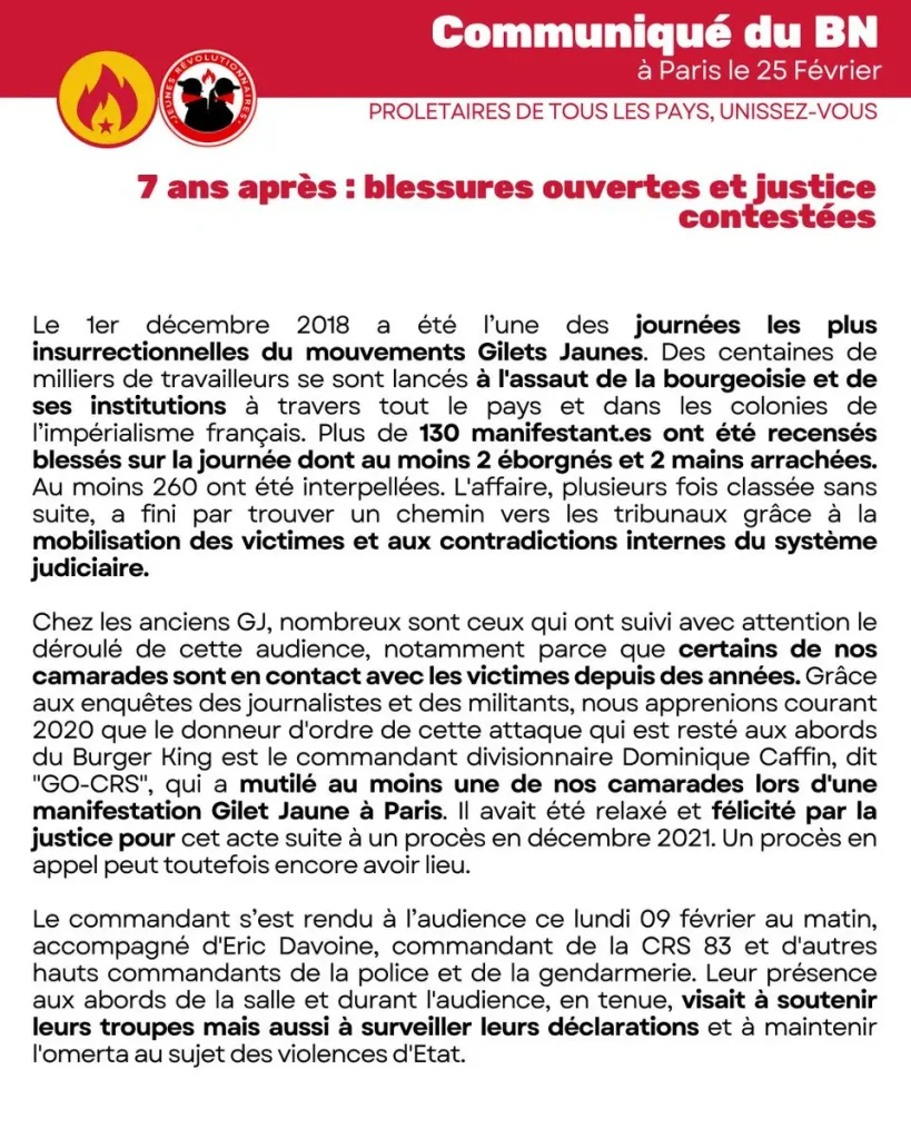 Without expecting anything from bourgeois justice, we emphasize that the prosecutor’s demands are particularly weak given the seriousness of the facts and the extent of the physical and psychological trauma inflicted on our yellow vest comrades. From 6 to 20 months suspended sentences. We have no illusions about the outcome of this trial, the ruling of which will be handed down on March 17 at the Clichy District Court. Although we admire the determination and perseverance of our comrades in seeking truth and justice in this case, we are all too familiar with the intransigence of the State and its justice system and its ability to organize impunity for its watchdogs.