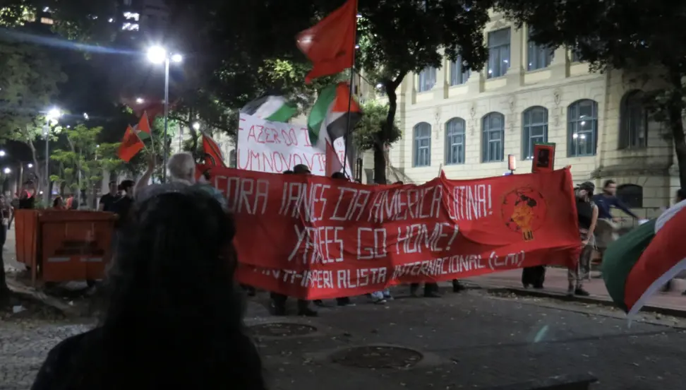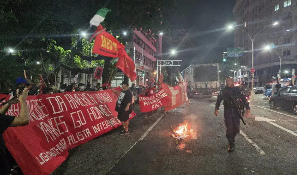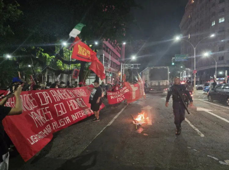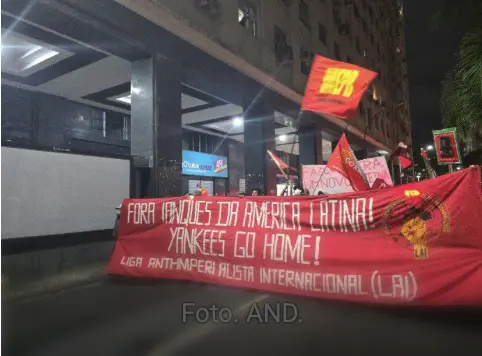 A combative anti-imperialist demonstration was held on March 3 in Rio de Janeiro, denouncing the ongoing imperialist aggression by the Yankees in Latin America and the Middle East, and praising the anti-imperialist struggles underway around the world. The demonstration began at 5 p.m. in Largo da Carioca and continued in a march that closed streets until reaching the US Consulate General, where red flares were lit and the flags of the Great Satan (US), and the Little Satan (“Israel”), were burned.