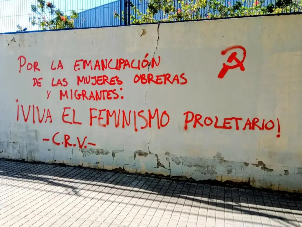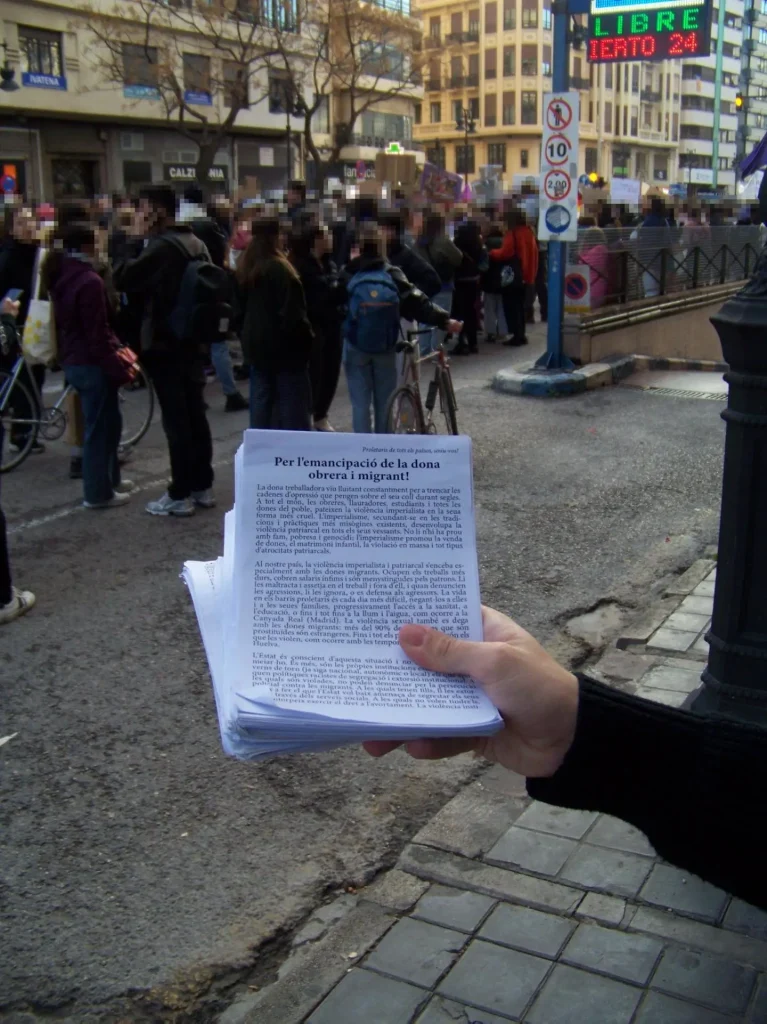 In the Spanish State, several posters and graffiti were done in the streets of several proletarian neighborhoods in Madrid and Valencia. They also spread leaflets in front of the Immigration Center of Zapadores in Valencia, during the 8th of March demonstration that took place in València.