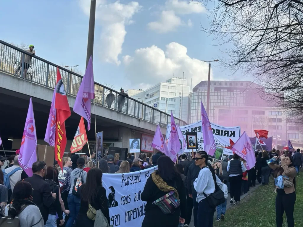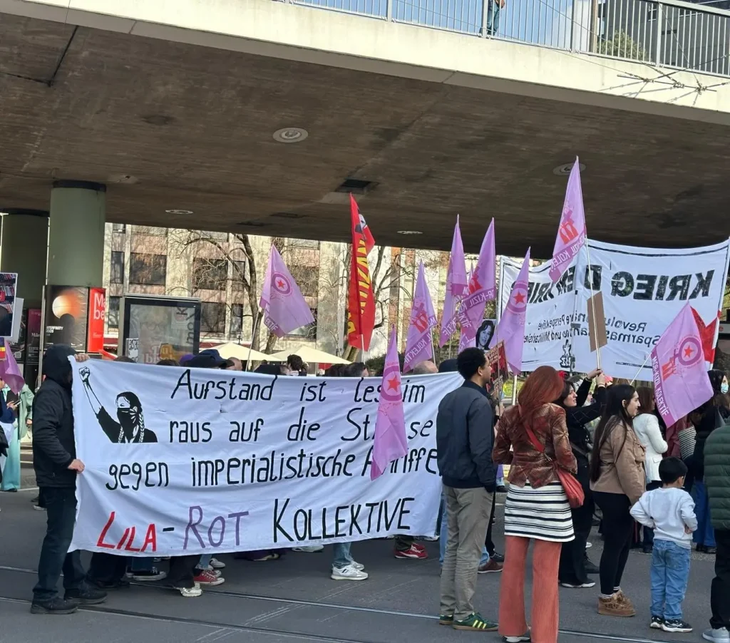 The Purple Red Collective issued a call in Switzerland with the slogan “Take to the streets on March 8th against imperialist wars.” Hundreds gathered in Basel and marched. Purple Red Collective marched with a banner which read “It is right to rebel, take to the streets against imperialist aggression”.