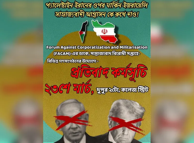 As the crisis in the national and international arena continues to grow, the fascist and imperialist attacks and aggressions in the political context are increasing. In this situation, on March 23rd, on the occasion of the day of martyrdom of the revolutionary comrades Bhagat Singh, Rajguru, and Sukhdev, who were martyred against British imperialism, and the anti-imperialist week, various mass organizations are calling for a protest program at College Street Square from 2 pm. Come, join us, strengthen the revolutionary mass resistance of the national and international struggling people.