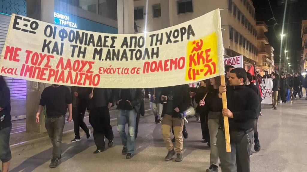 On Friday afternoon, student associations, unions and organizations of the left gathered at Georgiou Square, in Patras, in an anti-war demonstration. The Communist Party of Greece (Marxist-Leninist) [KKE (m-l)] also participated in the demonstration.