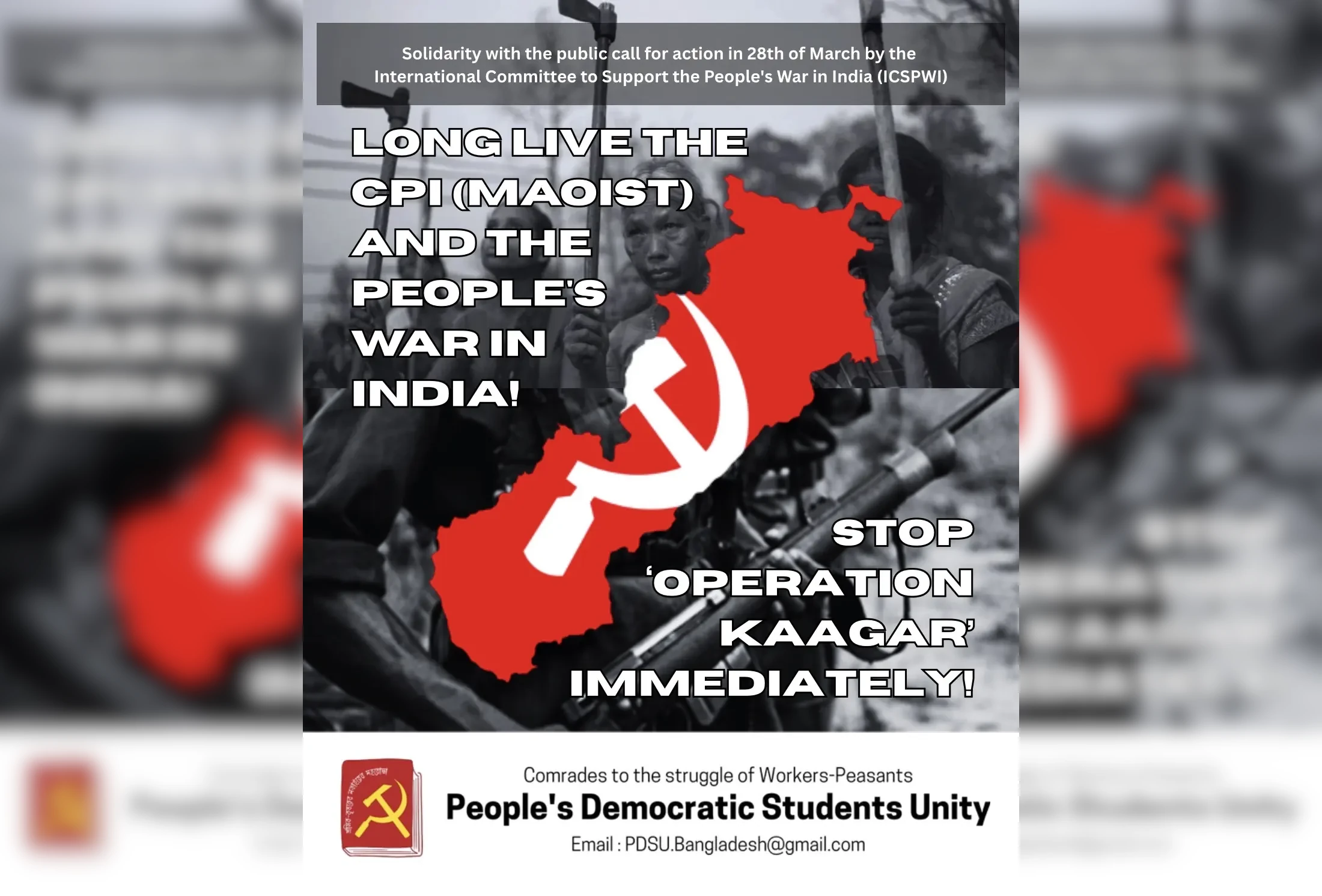 Impulsar cualquier lucha revolucionaria y democrática anticapitalista y antiimperialista en cualquier parte del mundo contribuye necesariamente al avance de la revolución proletaria mundial. Por lo tanto, apoyar la Guerra Popular en curso dirigida por el Partido Comunista de India (Maoísta) es una responsabilidad fundamental de todas las organizaciones e individuos revolucionarios, antifascistas, antiimperialistas y democráticos. Inspirados por este espíritu de internacionalismo revolucionario, nosotros, la Unidad Estudiantil Democrática Popular, hacemos un llamado a todas las fuerzas revolucionarias, democráticas y progresistas del mundo: resistamos las bárbaras masacres que se están llevando a cabo contra los revolucionarios maoístas y el pueblo adivasi bajo la “Operación Kaagar”; ¡alcemos la voz con más fuerza exigiendo su cese inmediato!