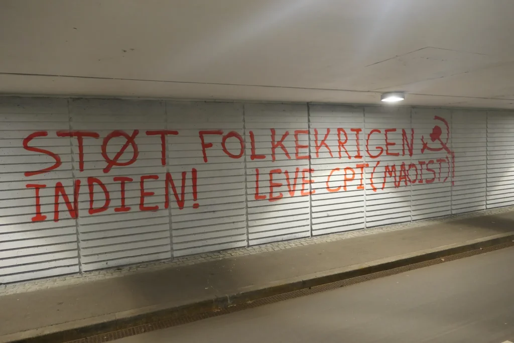 Røde Fane received documentation of a graffito made in support of the People’s War in India in Copenhagen, Denmark.