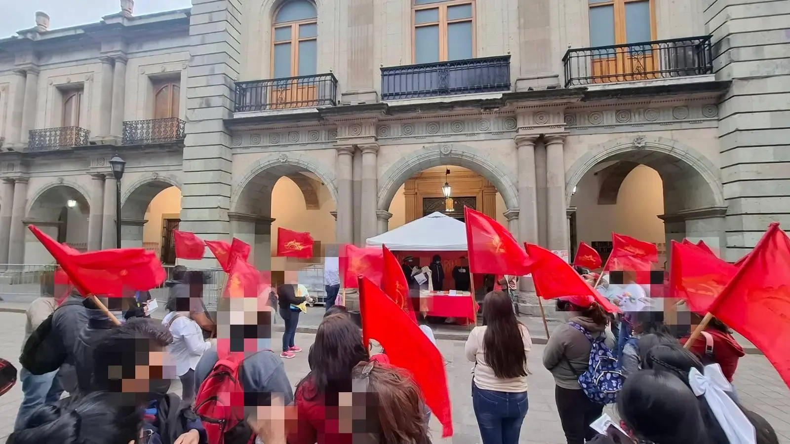 Featured image: Dozens rally in front of the government palace in Oaxaca. Source: Sol Rojo Mexico.