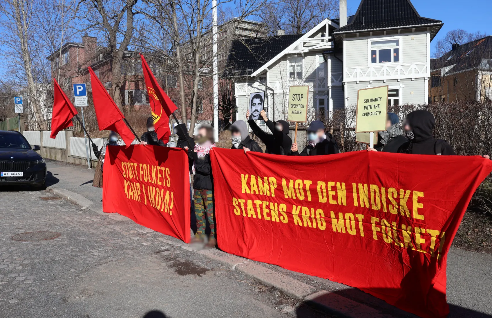 On March 28, a demonstration was held Oslo in front of the Indian embassy in Oslo, in support of the people’s struggle in India and against Operation Kagaar and the old Indian State’s war against the people. Kampkomiteen, the Sudanese Women’s Union and Revolutionary Communist League participated in the demonstration. Appeals were made, and slogans such as “Long live the struggle for New Democracy – the people of India will break free!”, “Inquilab Zindabad!” (“Long live the revolution!”), and “Lal salaam!” (“Red salute!”) were shouted.