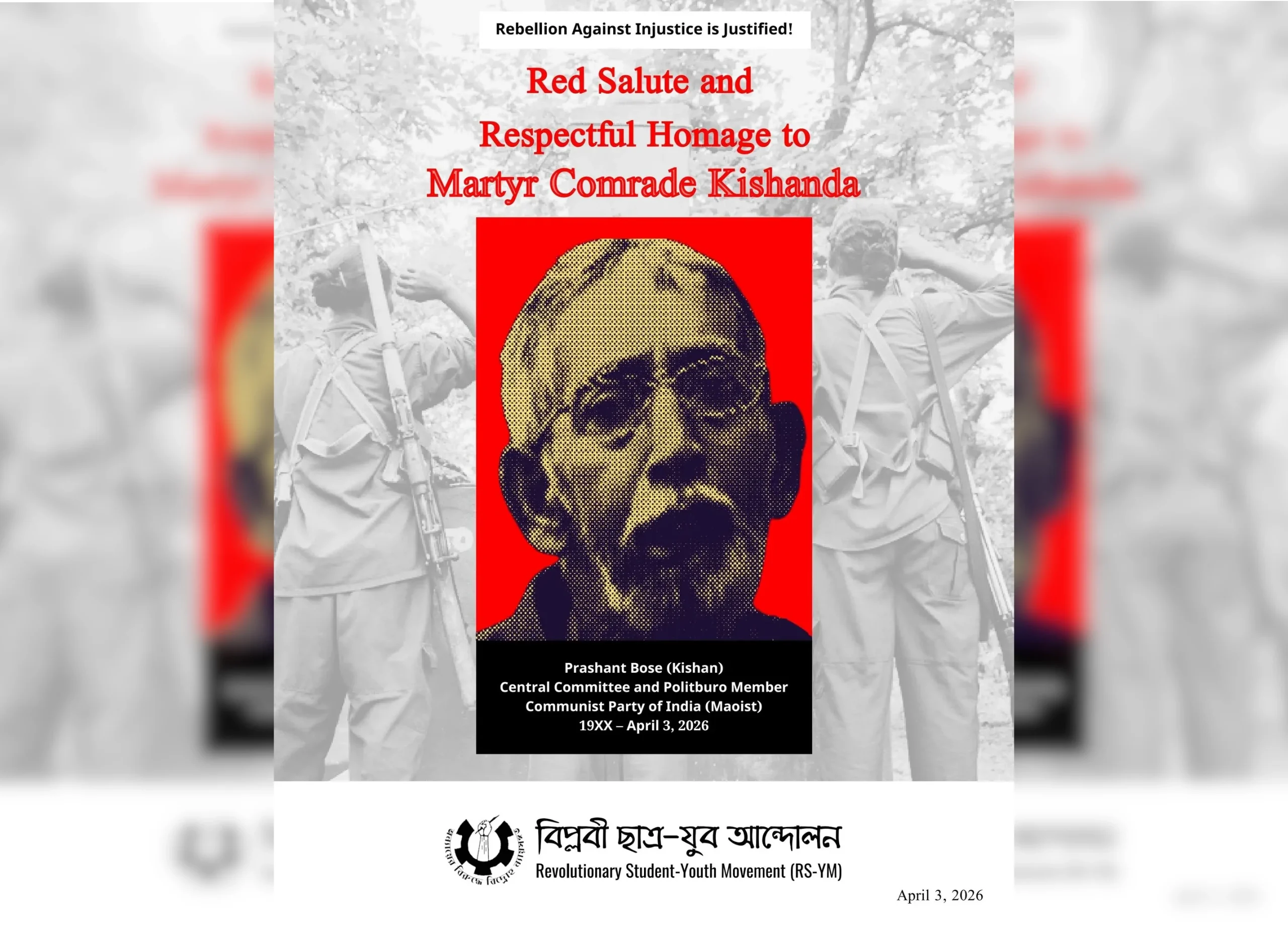 Hiermit veröffentlichen wir eine inoffizielle Übersetzung einer Erklärung der Revolutionären Studentenfront (RSF) vom 4. April: Genosse Prashant Bose, auch bekannt als Genosse Kishanda, Mitglied des Zentralkomitees und des Politbüros der…