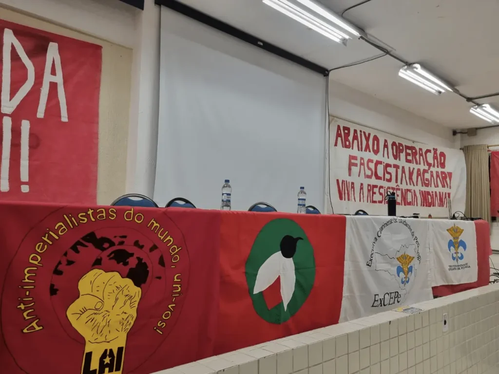 The speakers focused on analyzing the political situation and the advancement of the anti-imperialist struggle in Brazil and worldwide. From this perspective, they discussed the development of democratic and revolutionary struggles following the Al-Aqsa Flood, as well as the importance of the struggle against large landownership as part of the fight against imperialism in semi-feudal countries.