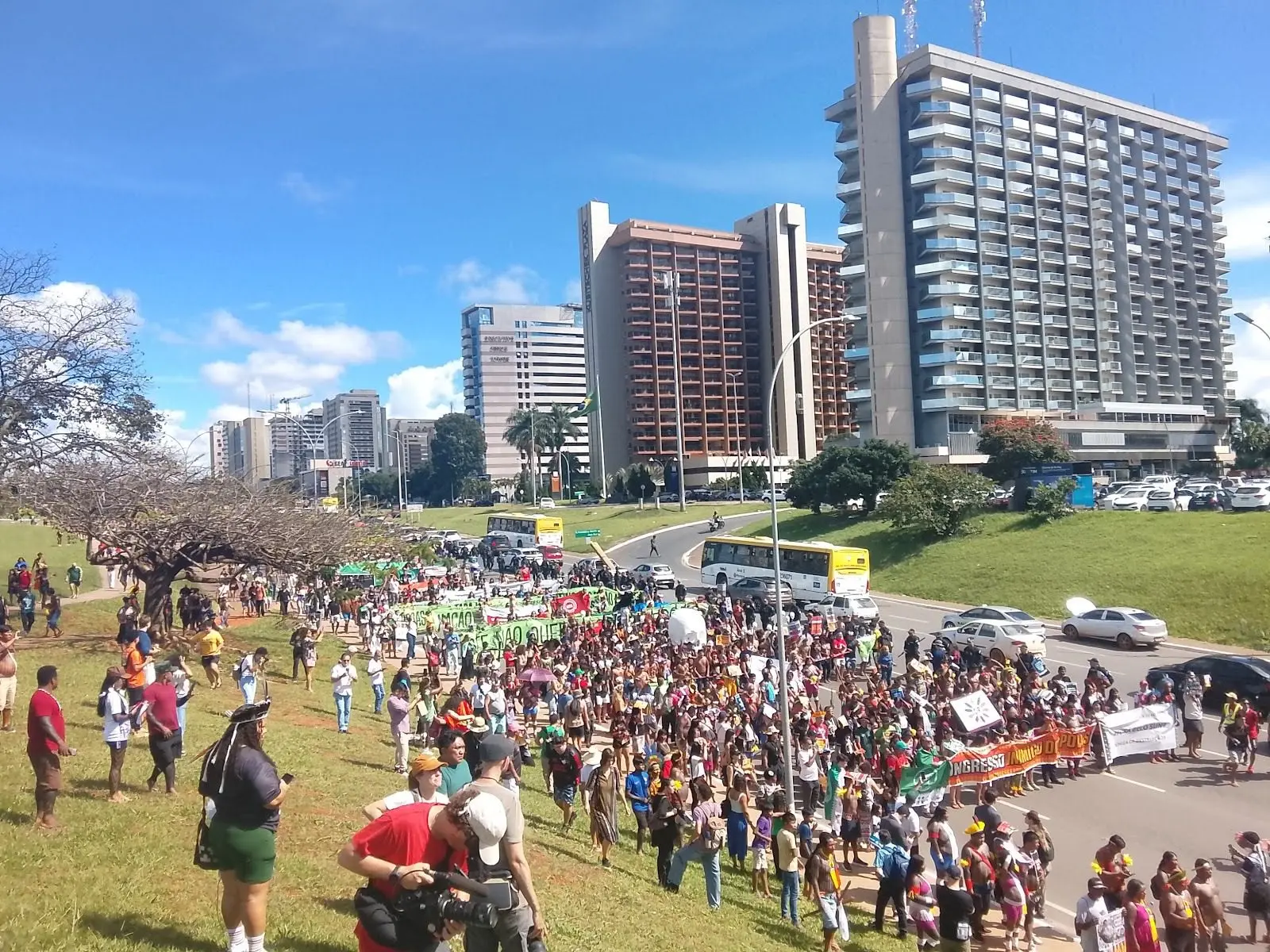 The protesters “denounced the genocidal role of the old State in collusion with latifundium, and the complicity of the current government.” AND reports that there were moments of heightened tension when the march approached the Parliament building, where the military police and the legislative police set up a blockade to prevent the protesters from passing.