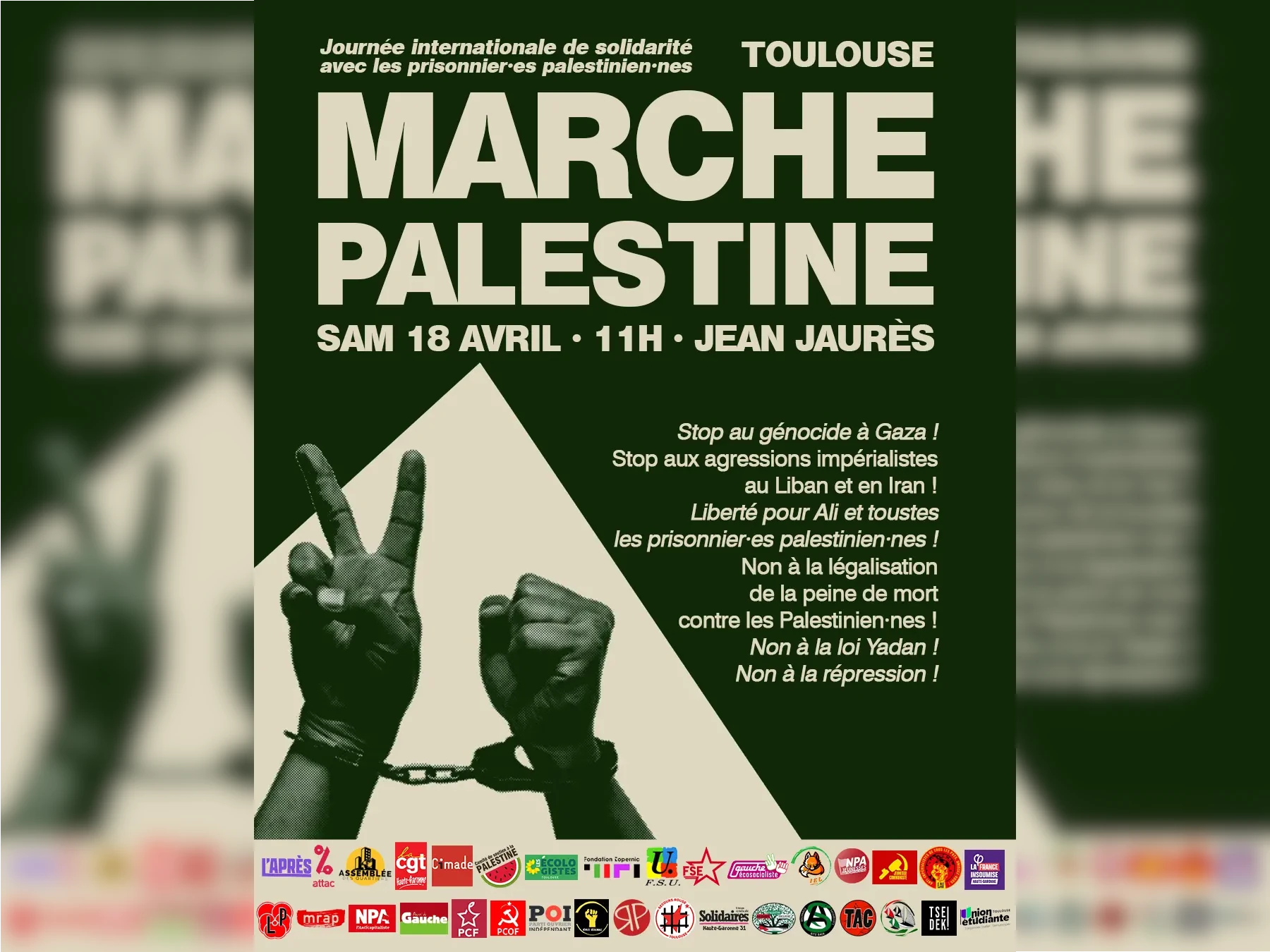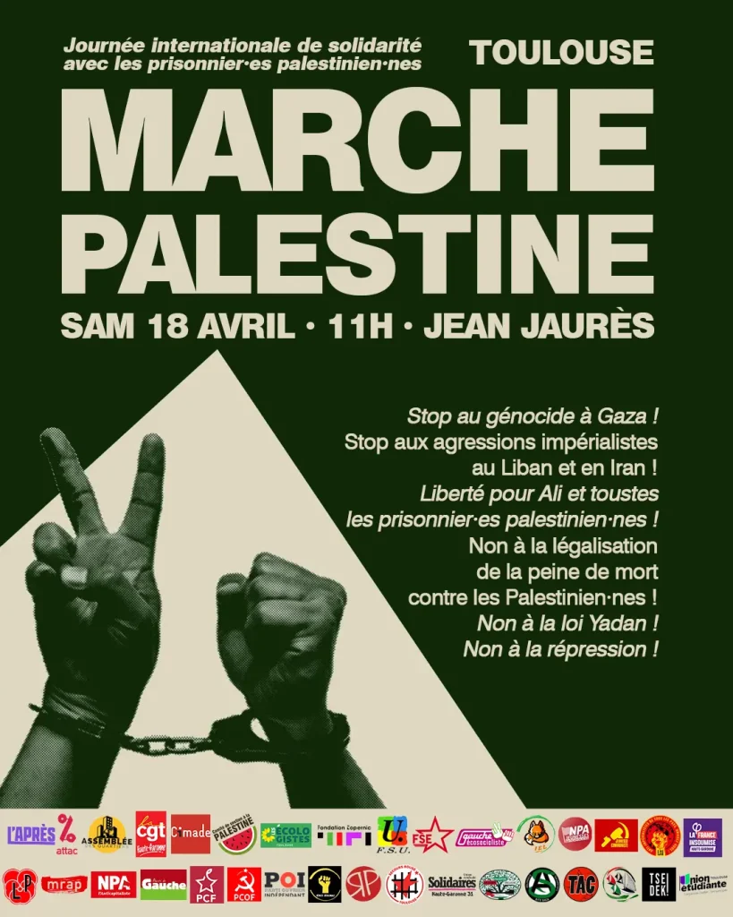 We hereby share a poster and call for a demonstration that will take place on April 18 in Toulouse. The march demands an end to the genocide in Gaza, and end to the imperialist aggression on Lebanon and Iran, the freedom for all the Palestinian Prisoners, rejects the death penalty for the Palestinian prisoners recently approved by the State of Israel, and protests the repression and Yadan Law in France.