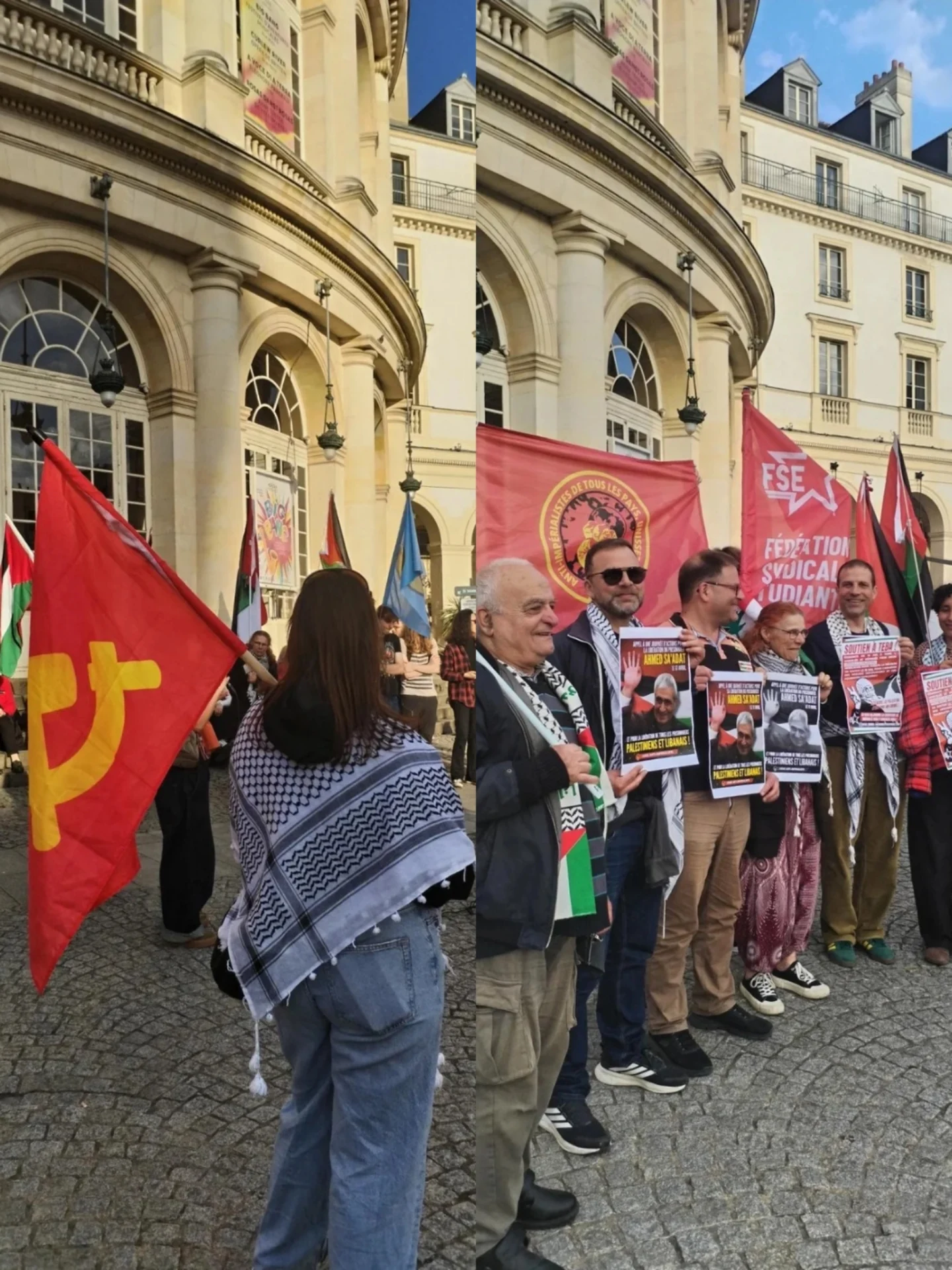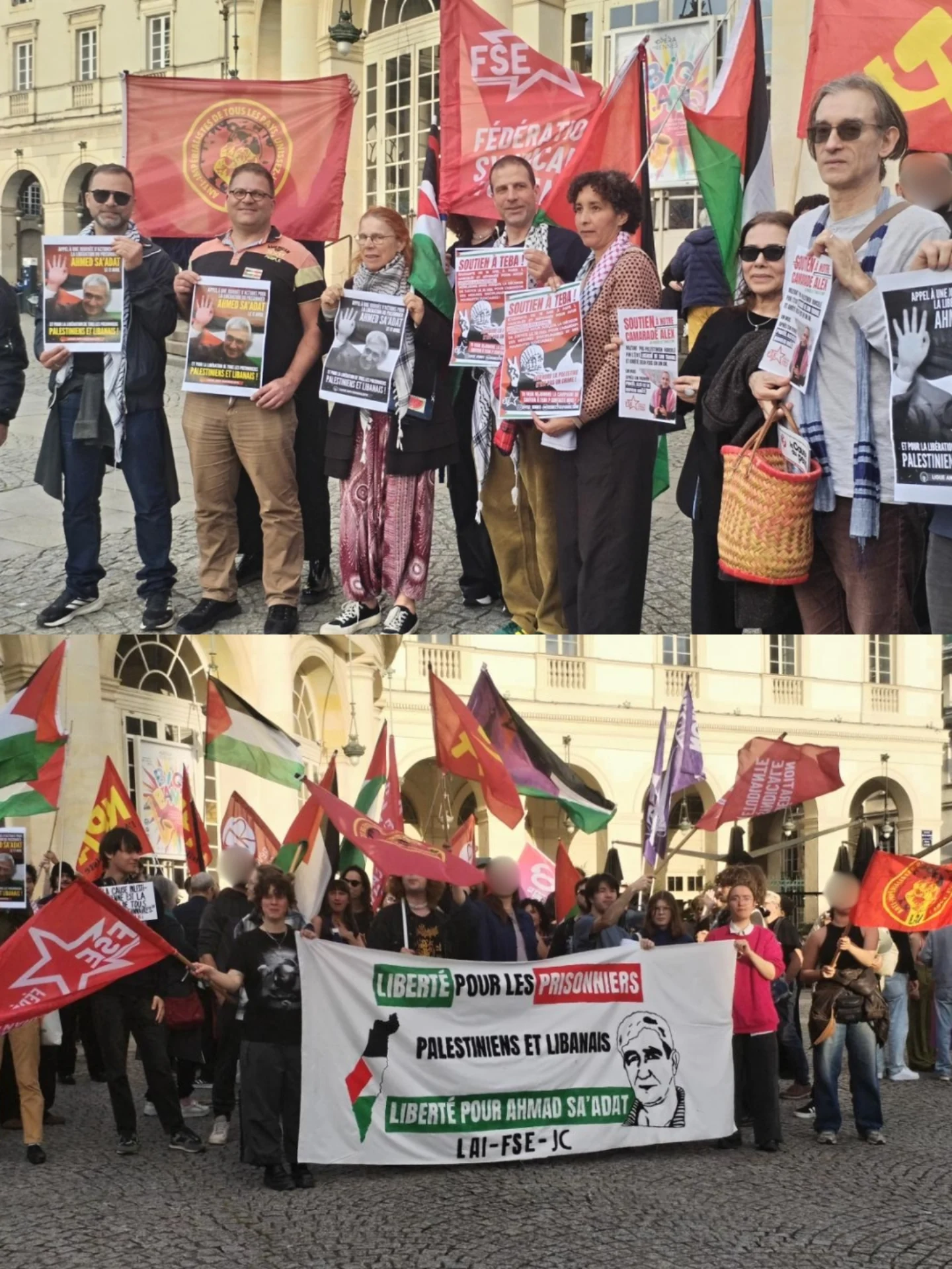 On April 17th The Communist Youth of France participated in a rally in Rennes for Palestinian and Lebanese prisoners, highlighting the release of Georges Ibrahim Abdallah, and voicing their commitment to the call from the International Anti-imperialist League (AIL) to support Ahmed Sa’adat, leader of the Popular Front for the Liberation of Palestine (PFLP). AIL and FSE Rennes were also present in the Rally.