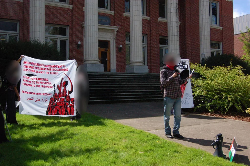 On University of Oregon campus, in front of the admin building, a rally was held by local Student for Justice in Palestine chapter, calling for the university to cut it’s ties to the Zionist state and for Americans in the belly of the beast to take up the fight against the increased Zionist and Imperialist aggression in Palestine, Lebanon, Iran, and more.