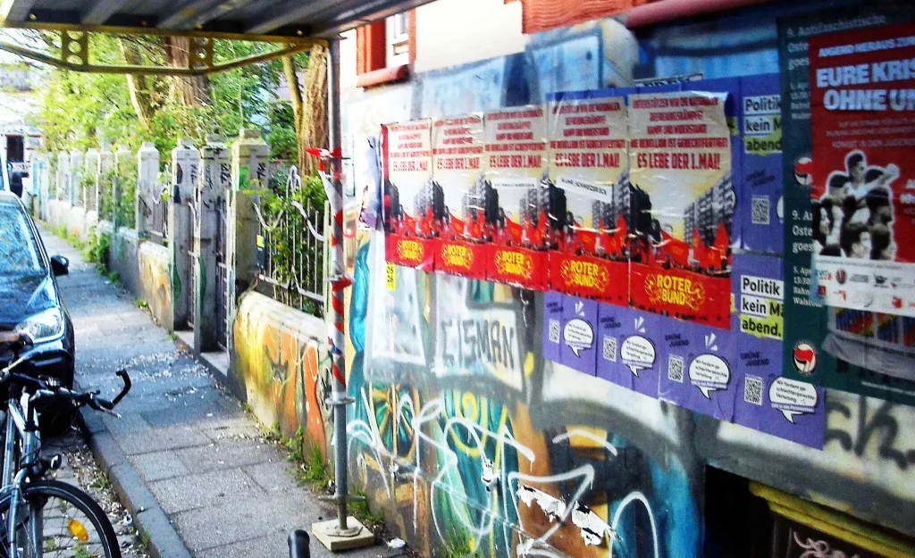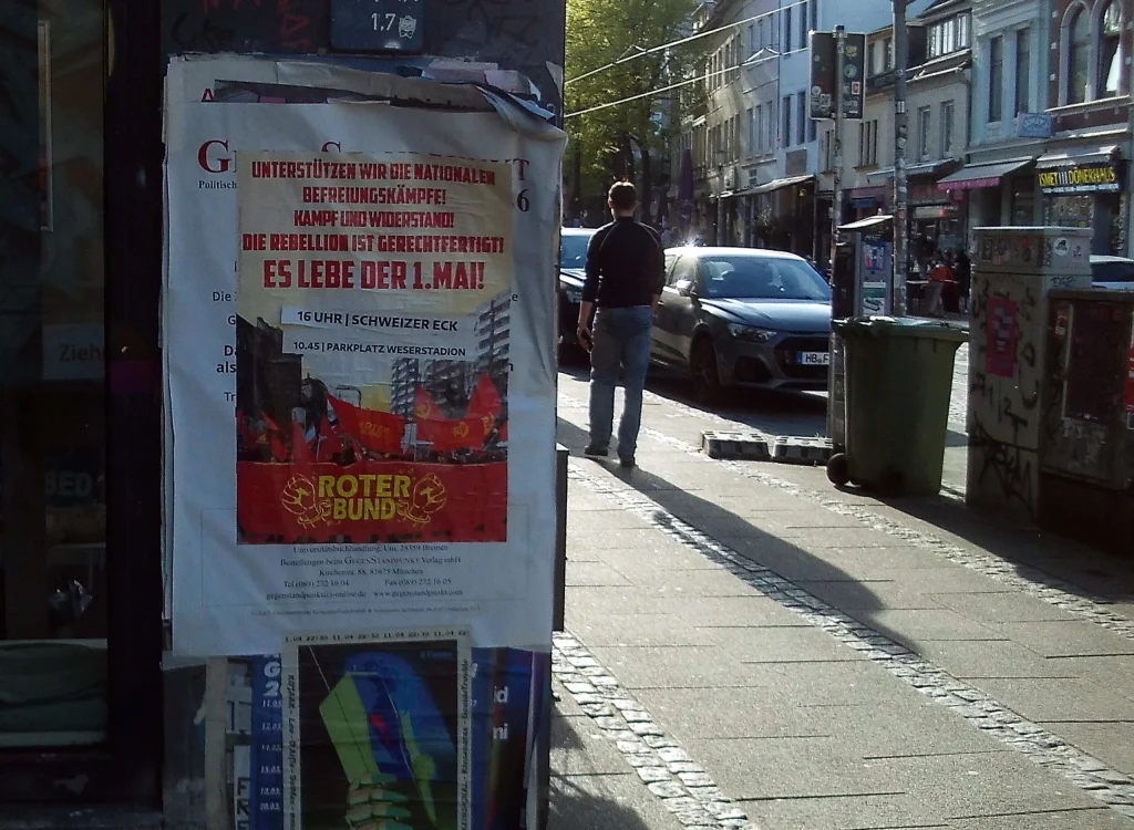 In Bremen, Germany, posters have been erected mobilizing for the May Day demonstration with the DGB demonstration starting at 10:45 at Weser Stadium, and a subsequent rally starting at 16:00 at Schweizer Eck.