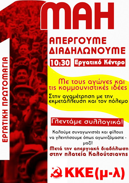 The KKE (ml) has made calls for the 1st of May mobilizations in several cities, including Chania at 10:00 at Agora Square, Ioannina at 10:30 at the Labor Center, Trikala at 10:00 at the Labor Center, Thessaloniki at 10:30 at Kamara, They also announce that there will be mobilizations in Athens at 10:30 at Korai Square, and Patras at 10:30 at the Labor Center. Posters have also been published.